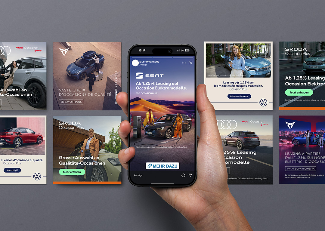 Für die Marken der AMAG Import AG entwickeln wir quartalsweise digitale Werbemittel, die aktuelle Leasing-Kampagnen wirkungsvoll inszenieren und zugleich die Awareness für die «Occasions Plus» zertifizierten Fahrzeuge steigern. Die Umsetzung erfolgt kanalübergreifend – von Google Ads über Onlinebanner auf relevanten Newsseiten bis hin zu zielgerichteten Social-Media-Kampagnen – und sorgt für eine konsistente Ansprache entlang der gesamten Customer Journey.